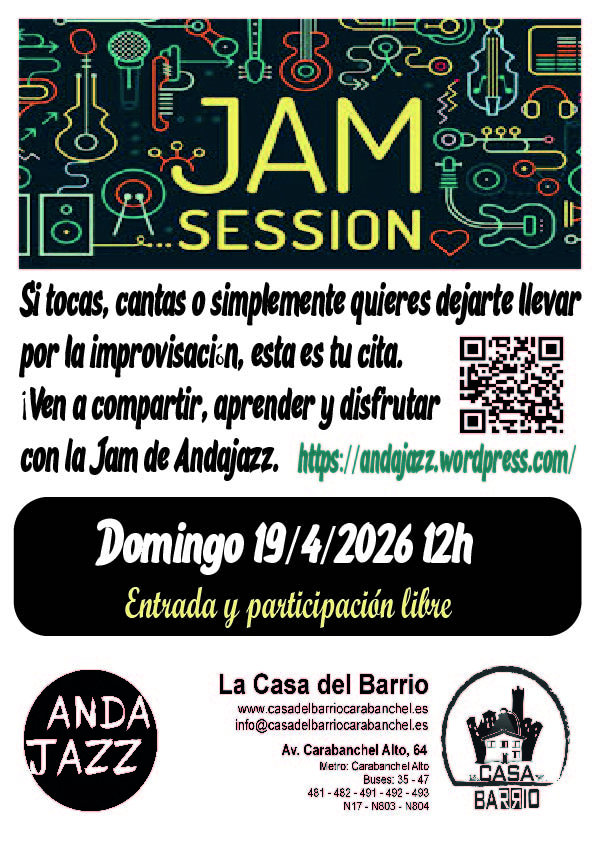 Este próximo domingo 19 de abril a las 12h, la Casa del Barrio de Carabanchel se llena de ritmo con una Jam Session de la mano de Andajazz.