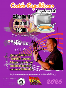 Un año más, queremos celebrar la República en Carabanchel, para ello, te animamos a participar en el tradicional Cocido de Carabanchel el sábado 11 de abril, para lo cual tienes que adquirir previamente el bono de 10 euros contactando con el Ateneo Republicano a través del correo electrónico que figura en el cartel.