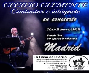 Acompañado de su guitarra, Cecilio Clemente nos interpreta canciones propias y versiones de otros cantautores, que hacen un recorrido muy especial de nuestras vidas, de los cuales hay bastante influencia en su música.
