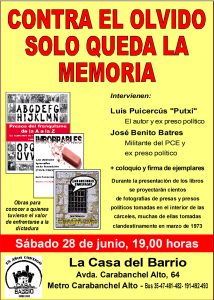 PUICERCÚS VÁZQUEZ “Putxi”, LUIS. (Madrid, 1951). Nacido en el barrio de Chamberí, en el seno de una familia trabajadora, inició sus estudios básicos y de bachillerato en el Colegio de los Salesianos de Estrecho, situado en la populosa confluencia de Francos Rodríguez con Bravo Murillo, en el que en 1936 se creó el Quinto Regimiento de voluntarios de la II República por iniciativa del Partido Comunista de España y las Juventudes Socialistas Unificadas. A partir de 1965 y gracias a una beca, estudió Artes Gráficas en la Universidad Laboral de Tarragona. A los 18 años comenzó su militancia antifranquista en las filas del PCE (m-l), organización integrada en el FRAP (Frente Revolucionario Antifascista y Patriota). Detenido en 1972 como responsable de una imprenta del partido en el interior que imprimía Vanguardia Obrera, órgano del Comité Central del PCE (m-l), y otros materiales contra la dictadura, fue juzgado y encarcelado cuatro años por asociación ilícita y propaganda ilegal. Muerto el dictador, salió en libertad. Militó en el Movimiento Ciudadano y en Comisiones Obreras, siendo elegido delegado sindical durante cuatro años. En 1980 se incorporó a asociaciones de solidaridad con Cuba y su Revolución, participando en tres Brigadas Internacionales de Trabajo Voluntario en la isla. En 2013 formó parte del núcleo fundador de La Comuna, presxs del franquismo, para recuperar su memoria y dar testimonio de las luchas y la represión de los últimos años de la dictadura. Lector aplicado y amante de la tinta y la imprenta, de la encuadernación y de esas Artes llamadas Gráficas, ámbito profesional en el que Luis ha desarrollado su vida, se incorporó en 2005 al arte mayor de los libros, consistente en escribirlos. Hasta la fecha ha publicado nueve: dos sobre la historia del barrio de Las Ventas; dos sobre las Brigadas de Trabajo en Cuba, incluida una guía del viajero a la isla; dos más sobre sus experiencias con el ictus y el cáncer. A destacar tres sobre sus recuerdos y testimonios militantes y carcelarios durante la dictadura. Hace 14 años inició una amplia recopilación de presos y presas del franquismo durante el período 1963-1977. En la actualidad está preparando un trabajo de ficción sobre la ejecución de un conocido torturador y una amplia recopilación de biografías de hombres y mujeres que lucharon contra la dictadura.